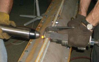 The bridge builders used a sledgehammer to drive in the rivets. Their successors are using a heavy pneumatic rivet gun.